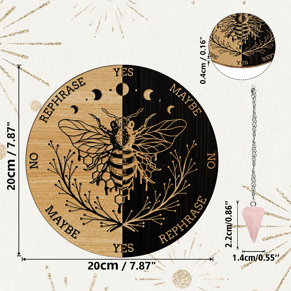 Swing into mystical territory with this charming Bees Pendulum Board! Featuring a striking wood and black split design, this divination tool showcases an enchanting bee motif that brings nature's wisdom to your spiritual practice. Perfect for pendulum readings, dowsing, or simply adding a whimsical touch to your collection.
