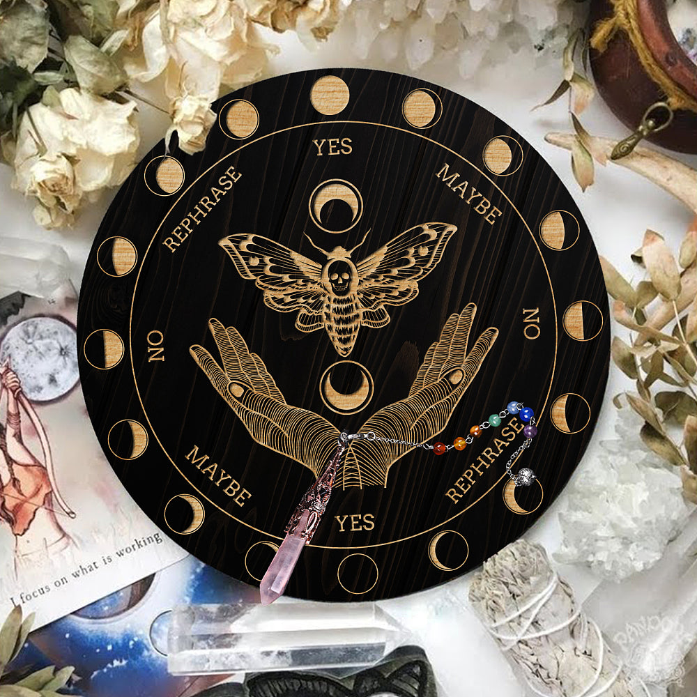 Summon the mystical vibes with this enchanting Deaths Hawkmoth Pendulum Board, your gateway to wisdom and cosmic curiosity. Featuring intricate lunar phase illustrations, this beautifully designed board guides your pendulum through the moon's celestial dance.