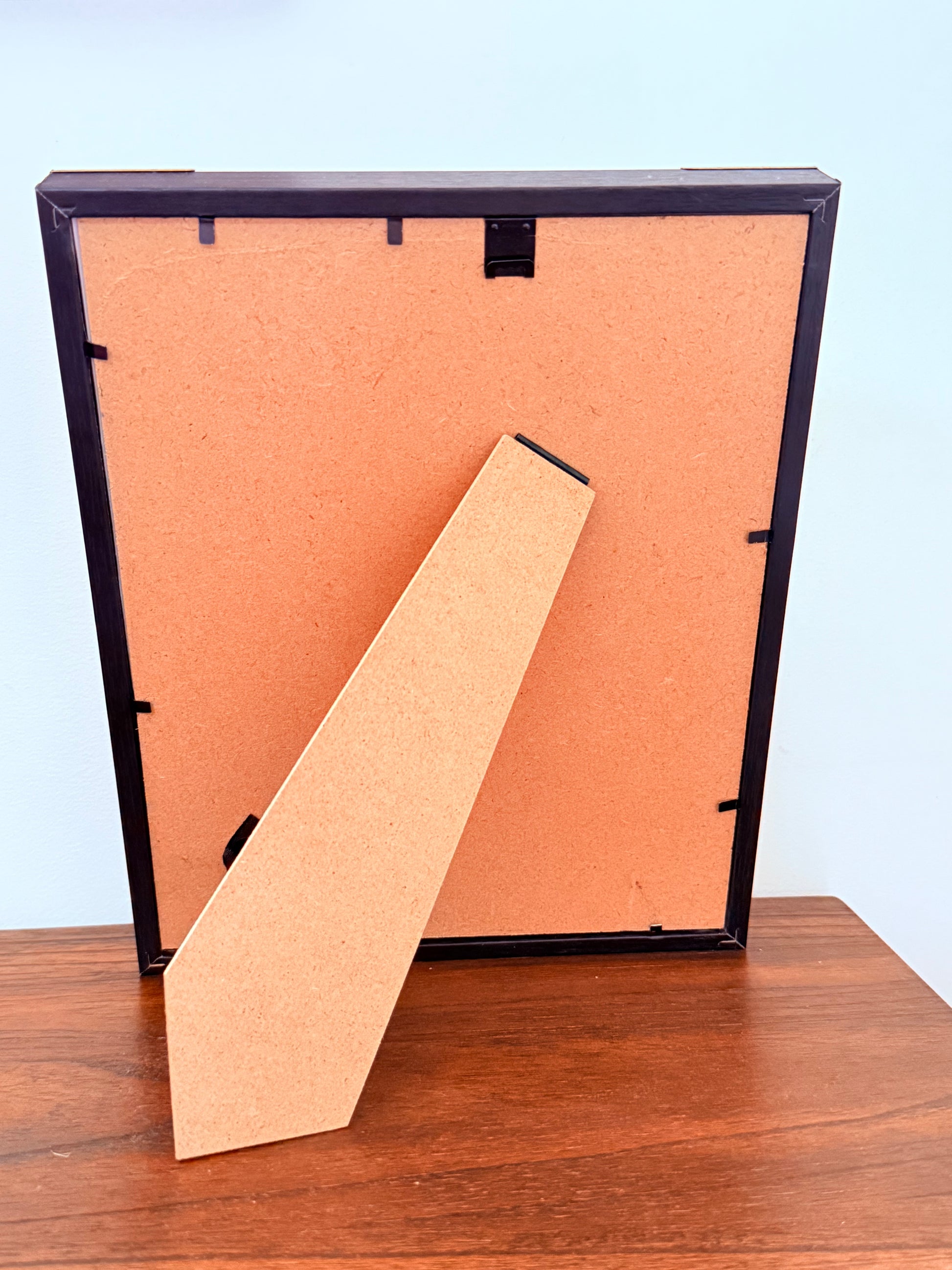 Width: 22.5cm Depth: 3.5cm Height: 27.5cm. This frame has a stand on the back of it to display your piece.