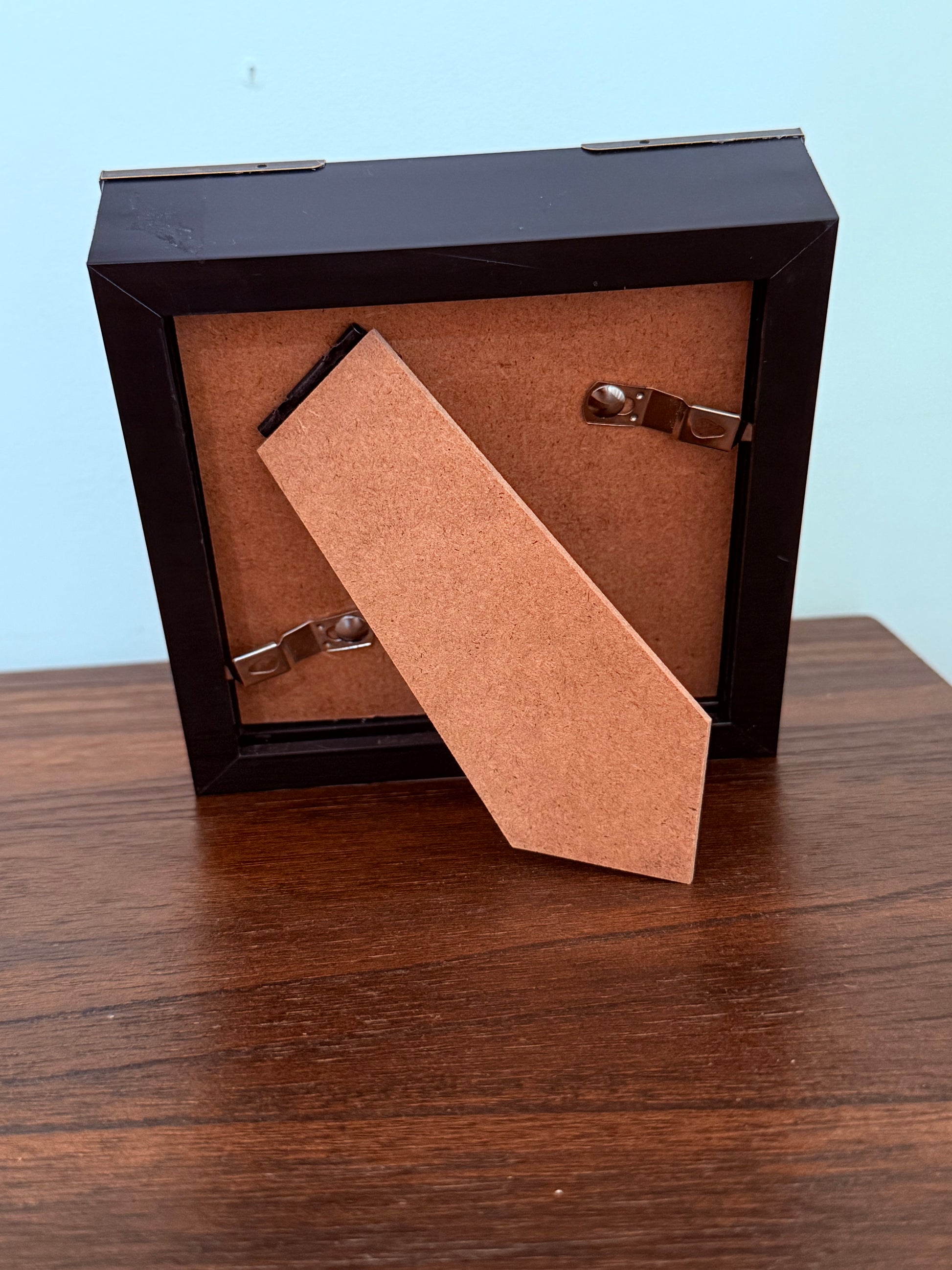 This frame has a stand on the back of it to display your piece.